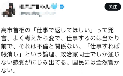 也有一些日本网民对高市早苗的说辞感到困惑。有日本网民说,“完成工作是理所当然的,跟出轨没有关系。‘只要完成工作就能将功抵过’,这种政客说辞无法得到国民的谅解。”